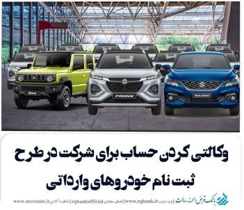 مشتریان بانک قرض الحسنه رسالت می توانند جهت ثبت نام در طرح جدید پیش فروش خودروهای وارداتی درخواست وکالتی نمودن حساب خود را از طریق سامانه پیشخوان مجازی رسالت در اِم رسالت به نشانی www.mresalat.ir به صورت غیرحضوری ثبت نمایند.
