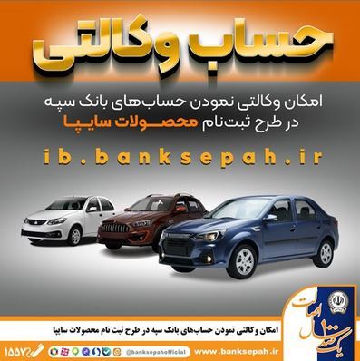 مشتریان گرامی بانک سپه می‌توانند برای وکالتی نمودن حساب‌های خود و شرکت در طرح ثبت‌نام پیش‌فروش آذرماه 1404 محصولات سایپا برای خرید محصولات این شرکت، به صورت غیر‌حضوری از طریق همراه بانک و لینک ib.banksepah.ir اقدام کنند.