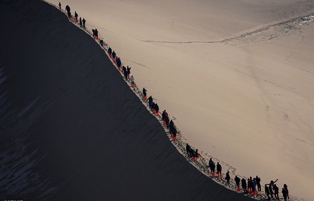 پیاده روی گردشگرها روی کوه های شنی استان «گانسو» چین