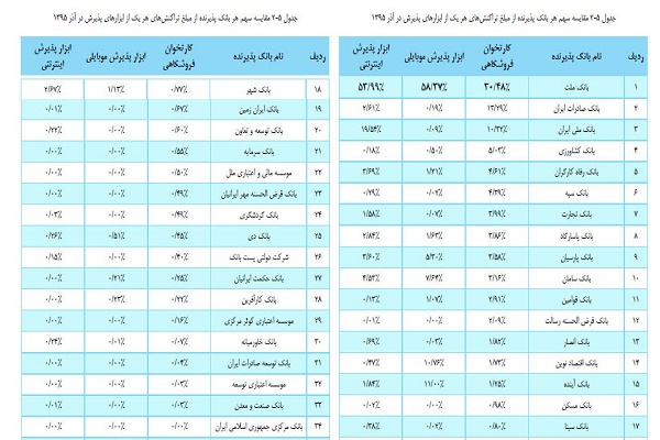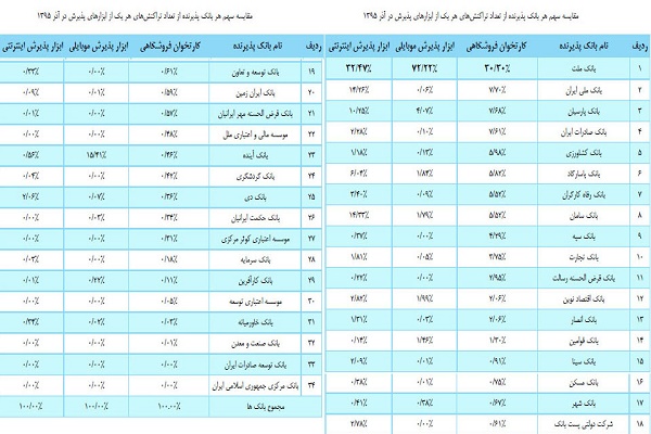 بر اساس این گزارش بانک صادرات با سهم ۱۳,۲۹ درصدی در رتبه دوم، بانک ملی ایران با سهم ۱۰.۳۲ درصدی در رتبه سوم و بانک کشاورزی با سهم ۵.۰۳ درصدی رتبه چهارم را از مبلغ تراکنشهای کارتخوانهای فروشگاهی را به خود اختصاص دادند و همچنین بانکهای ملی، سامان و رفاه کارگران به ترتیب با سهم ۱۹.۵۴، ۴.۵۳ و ۳.۶۹ درصدی در جایگاه دوم تا چهارم در مبلغ تراکنشهای اینترنتی قرار گرفتند و بانکهای آینده، اقتصاد نوین و سامان نیز با ۱۱، ۱۰.۷۶ و ۷.۶۴ رتبه دوم و سوم را در مبلغ تراکنشهای ابزار پذیرش بانکی در آذرماه سال ۹۵ کسب کردند.